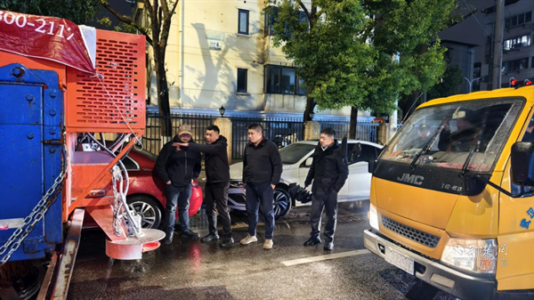 街道嚴(yán)格落實(shí)24小時(shí)應(yīng)急值班制度,一方面組織執(zhí)法隊(duì)員加強(qiáng)路面動態(tài)巡查,及時(shí)排查處置積雪壓枝、招牌松動等安全隱患;另一方面,環(huán)衛(wèi)隊(duì)伍持續(xù)開展夜間撒鹽防凍和巡查清理作業(yè),防止道路夜間結(jié)冰,確保次日清晨通行安全。