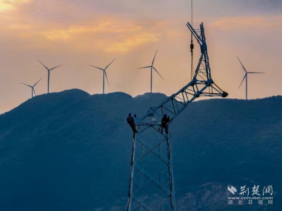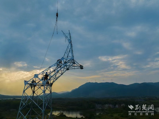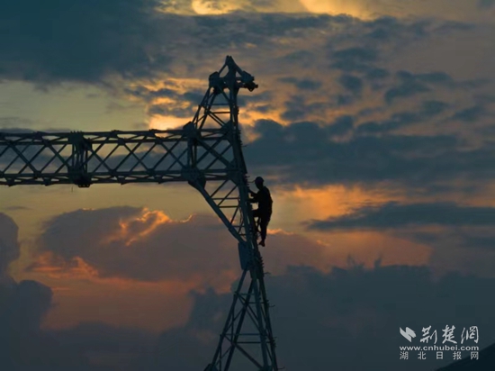當(dāng)天下午6點,夕陽染紅了天際。在斜輝映照下,4名電力工人挺立在鐵塔上,準(zhǔn)備最后的螺栓緊固工作。