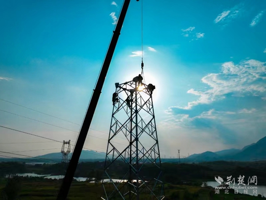 荊楚網(wǎng)(湖北日報網(wǎng))訊(通訊員曹祥魁 袁勝)8月23日下午5點,黃石陽新縣陶港鎮(zhèn)祠堂畈附近,40多米高鐵塔上4名電力工人渾身濕透,他們扶著頭頂上吊車吊過來的鐵部件,開始了最后“一吊”的組塔工作。