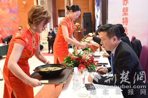 經過精心制作,菜品《三顧茅廬》《蒲圻魚嘴》《茶香紅酒牛肉》《赤壁魚羊鮮》等極具咸寧地方特色的美食香飄四溢,讓現場觀眾一飽眼福,滿足味蕾需求的同時,也展示了地方飲食文化特色。