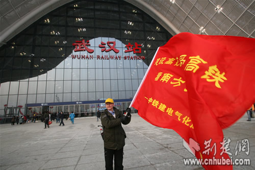 一位武漢站的建設(shè)者在站前廣場(chǎng)揮動(dòng)旗幟,今天他們將坐上首列開往廣州的高鐵。
