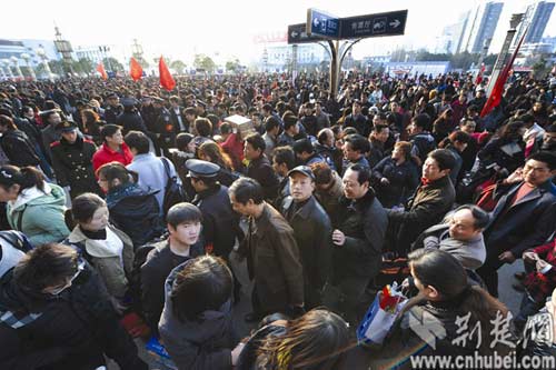 記者今日上午到武昌站轉(zhuǎn)了轉(zhuǎn),和春節(jié)幾天相比,站前廣場(chǎng)的客流明顯增多,幾趟臨客的發(fā)車(chē)招牌豎在廣場(chǎng)上,到點(diǎn)會(huì)有引導(dǎo)員引導(dǎo)旅客依次進(jìn)站?梢哉f(shuō)是忙亂中仍然井然有序。據(jù)了解,昨天,鐵路春運(yùn)客流出現(xiàn)新高潮,武漢鐵路局共發(fā)送旅客51.14萬(wàn),再創(chuàng)歷史新高,旅客發(fā)送量約占全國(guó)鐵路旅客發(fā)送量的十分之一。