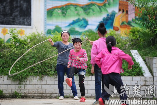 趙曉曉和孩子們一起跳繩。