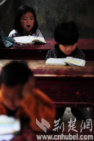 孩子們?cè)谄D苦的環(huán)境下晨讀。