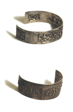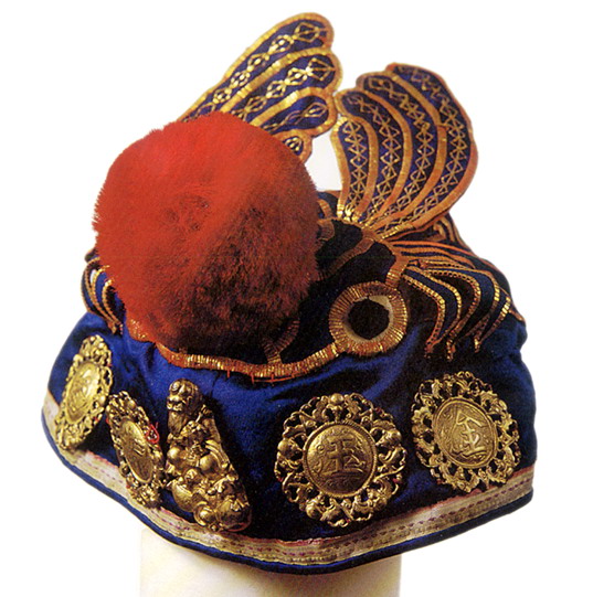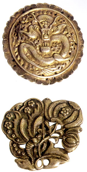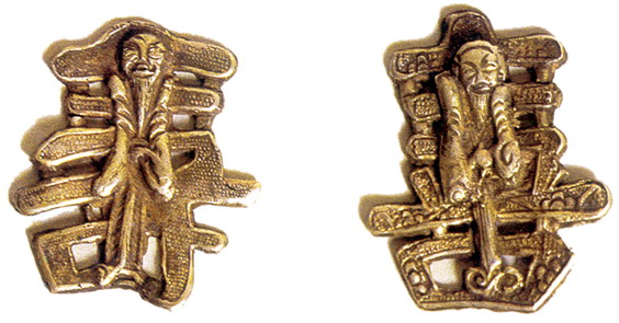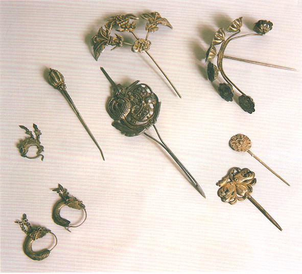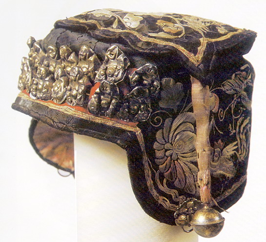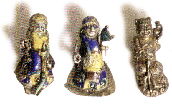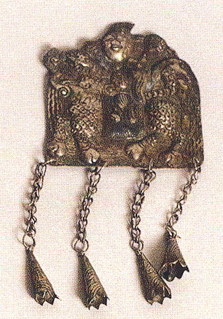 銀飾以白銀為原料,純度高,久用耐磨,不易腐蝕,光澤奪目,極顯高貴;一般為富裕人家的飾物,常有耳墜、戒指、手鐲、發(fā)簪、手鏈等。最為精彩的是帽飾人物,常用高浮雕、淺浮雕、鑲嵌和鏤空的表現(xiàn)手法,圖案多為龍鳳吉祥、長命富貴、麒麟送子等。